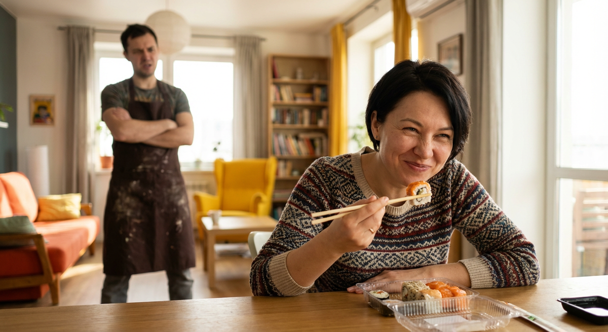 – Да она заказала себе еду из ресторана! – выпалил Виктор, пытаясь защититься. – Сама поела суп с роллами, а меня заставила вот это делать!
