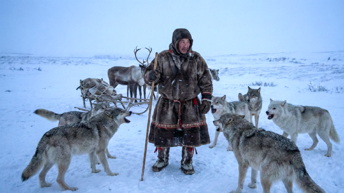 Вокруг стойбища, на границе света от фонарей, начали появляться тени. Одна, две, десять... Крупные, сильные звери. Их глаза светились зеленью в темноте. Стая пришла. Оленеводы замерли, направив ружья на волков. Степан держал на мушке вожака — огромного черного зверя, стоявшего впереди всех. Палец дяди лежал на спусковом крючке. Одно движение — и начнется бойня.