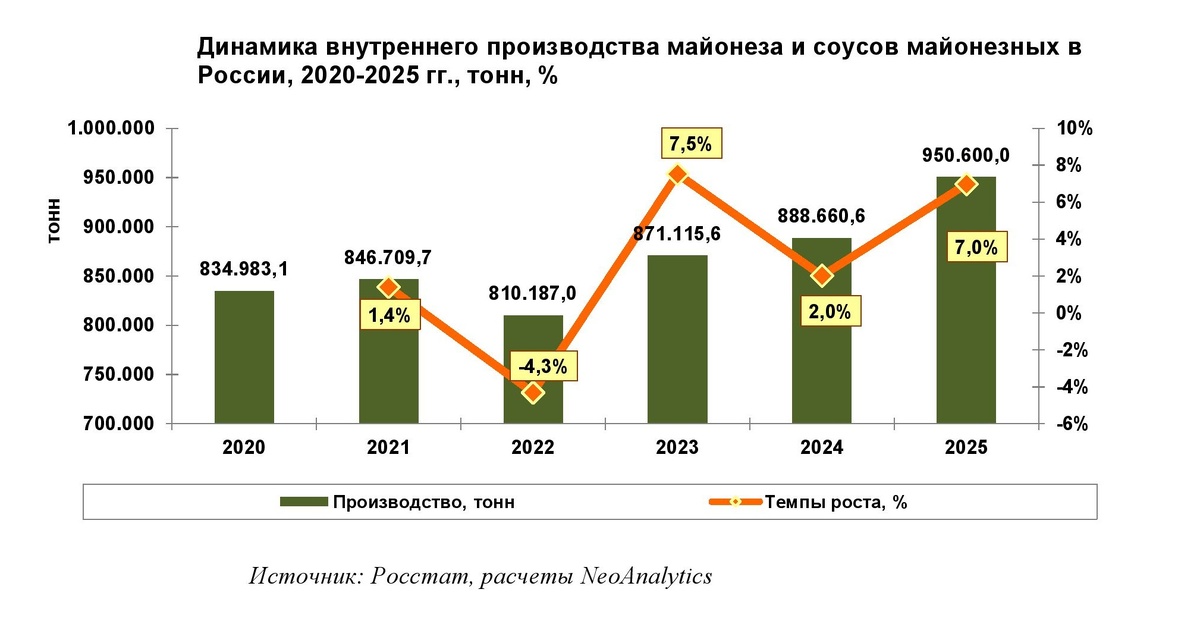 В ходе исследования, проведенного NeoAnalytics на тему «Российский рынок майонеза: итоги 2025 г., прогноз до 2029 г.», выяснилось, что 2025 г. стал достаточно благоприятным для российских производителей майонеза. Так, к примеру, по итогам 2025 г. объем внутреннего производства вырос на 7% в отношении аналогичного показателя годом ранее и составил 950,6 тыс. тонн продукции. В 2025 г. показатель отечественного выпуска приблизился к рубежу в 1 млн. тонн. Годом ранее динамика выпуска несколько замедлилась. Крайне негативным годом стал 2022 г., когда производство за год сократилось на 4,3%. В 2023 г. темпы прироста были также впечатляющими. Анализ помесячной статистики в ретроспективе периода 2024-2025 гг. показывает, что в течение 2025 г. практически во всех месяцах объемы производства были больше аналогичных периода 2024 г. И только в марте и июле 2025 г. производство несколько просело. В общей структуре российского производства майонеза и соусов майонезных в России в разрезе ассортимен