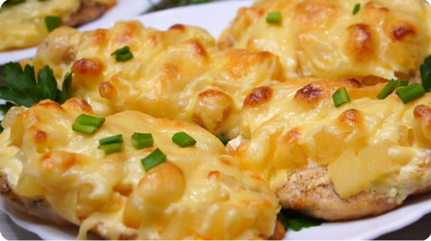 Здесь все продумано: быстрое обжаривание сохраняет сок внутри мяса, сметано-майонезная смесь создает нежный соус, ананасы дают приятную сладость и кислинку, а сыр образует аппетитную корочку. Результат — курица, которая действительно легко режется вилкой.