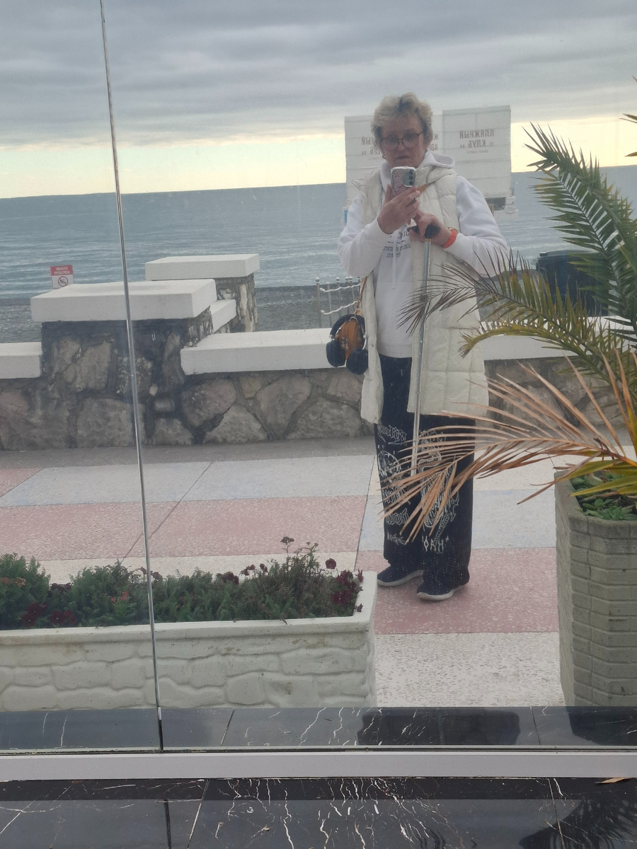 Набережная санатория радует своим ярким покрытием. Все таки не мешало бы все это подновить, честное слово. А то как то слегка все завяло. И сетки меня бесят, которые огораживают санаторий от вандалов, как я понимаю. С одной стороны правильно, а с другой стороны как то не очень это смотрится. Тем более тут все таки красиво, даже зимой. А я ускорилась, мечтаю присесть. На глаза попалось табло. Температура воздуха, 11°С, температура воды, 19°С. Екарный бабой, декабрь, а можно глотнуть коньячку и залезть в море. Я как то лазила в 18° купаться. Адреналина не хватало. Сейчас сильно подумаю, а нужно ли мне это? Даже в жару