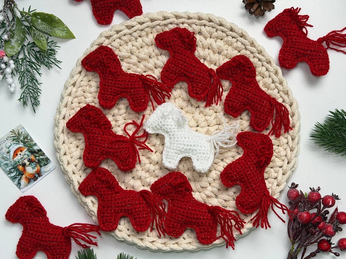 Я очень люблю это благородное животное. Если вы еще не успели связать лошадок, то скорее вязать вместе со мной. Для вязания вам потребуется: 1. Пряжа, у меня Alize Sal simli, 460 м/ 100 г. 2. Крючок 2,5 мм. 3. Наполнитель. Вяжем одну ножку: 1. 4 воздушные петли (ВП) 2. 3 СБН (столбик без накида) 3. 1 СБН + прибавка (пр) + 1 СБН 4-5. 4 СБН обрезаем нить. Начинаем вязание второй ноги аналогично, но нить не обрезаем. 6. 3 СБН + пр + 3 ВП + присоединяем вторую ногу соедительной петлей+ пр + 3 СБН (13) 7-9. 13 СБН 10. Убавка (уб) + 11 СБН (12) 11. 10 СБН + уб (11) 12. Уб + 8 СБН + пр 13. Пр + 4 СБН + уб 14. Уб + 4 СБН + пр + 4 ВП 15. 4 СБН + пр + 3 СБН + уб 16. Уб + 3 СБН + пр + 4 СБН 17. 5 СБН + пр + 2 СБН + уб 18. Уб + 2 СБН + уб 19. 2 уб Вяжем две детали, связываем СБН и набиваем наполнителем. Оформляем гриву и хвост. Наша лошадка готова. Вы уже связали символ будущего года? Делитесь своими работами 💕🎄 #вязаниекрючком