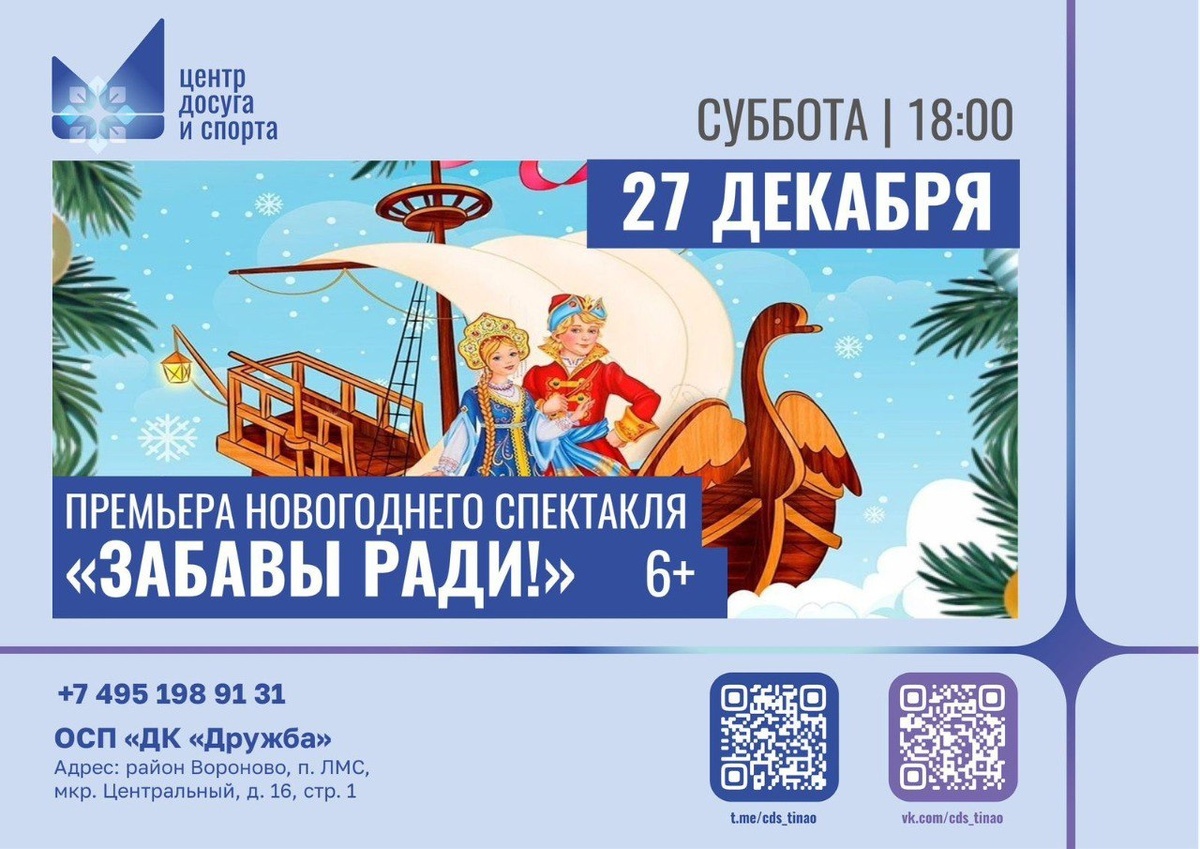 »! 🎅🎄✨ Мамы и папы, бабушки и дедушки, а также их детки и внуки! Вам наверняка хорошо знаком яркий, музыкальный мультфильм Гарри Бардина «Летучий корабль»! Песни из этого мультфильма уже давно живут самостоятельной жизнью, и на них выросло не одно поколение. Теперь же с любимой сказкой о любви, о трудностях, преодолеваемых на пути к безоблачному счастью, а также с новогодним волшебством, можно встретиться и на нашей сцене! 💖 В основе произведения — забавная и поучительная история о неунывающем трубочисте Иване, красавице-царевне Забаве, властолюбивом богаче Полкане, добром Водяном, весёлых Бабках-Ёжках и ещё о многих других сказочных персонажах! 🧙♀️🐸 И, конечно, кульминацией праздника станет появление самого доброго волшебника – Деда Мороза и его внучки Снегурочки! ❄️ Приходите всей семьёй окунуться в атмосферу новогодней сказки! 👨👩👧👦🌟 #анонсывороново #новоститинао #анонсытинао