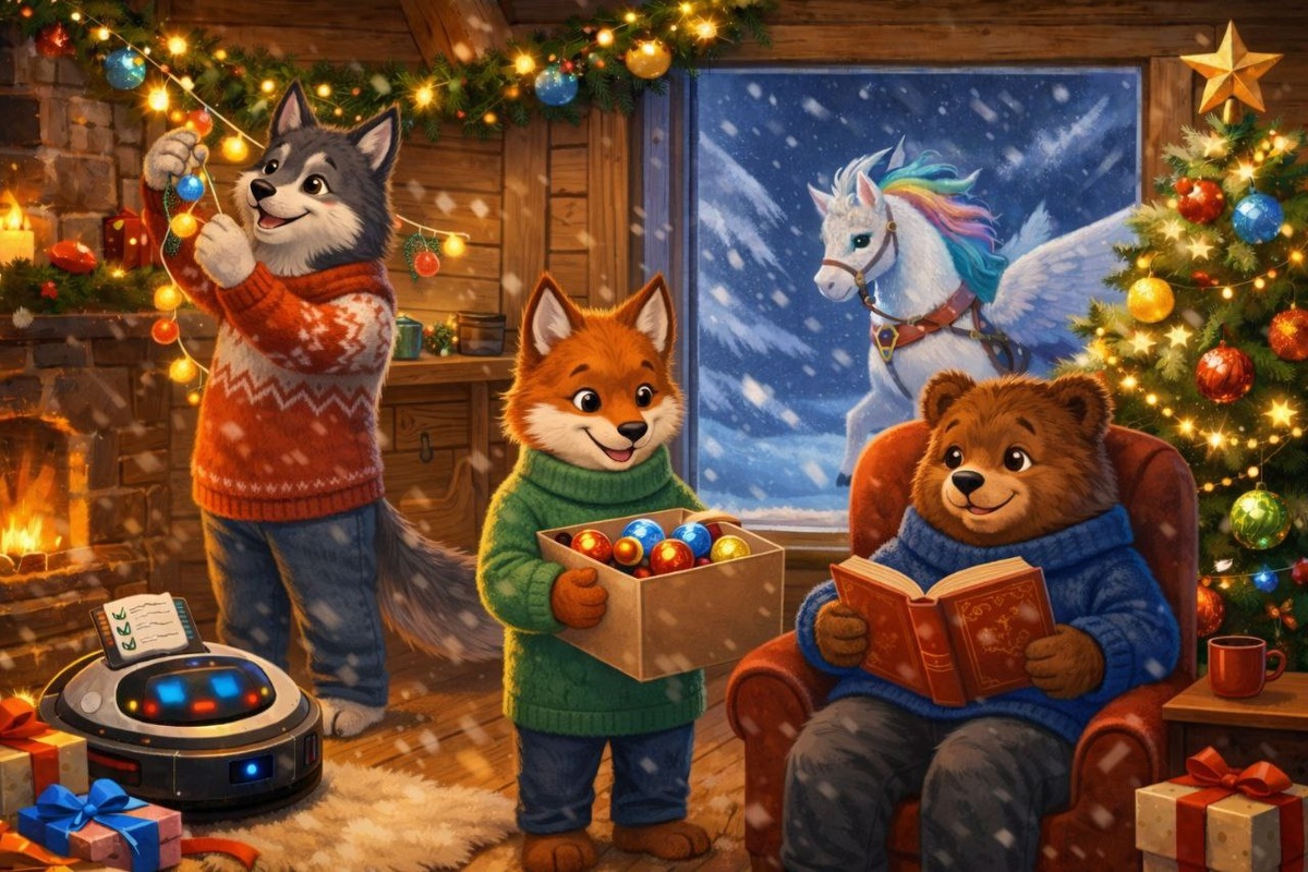 Волк готовился к празднику: развешивал гирлянды, вешал шарики, готовил подарки. Делал он это не один, а вместе с роботом-пылесосом, которого сам же и создал. Робот подсказывал ему по списку, кому и что нужно подарить на Новый год.