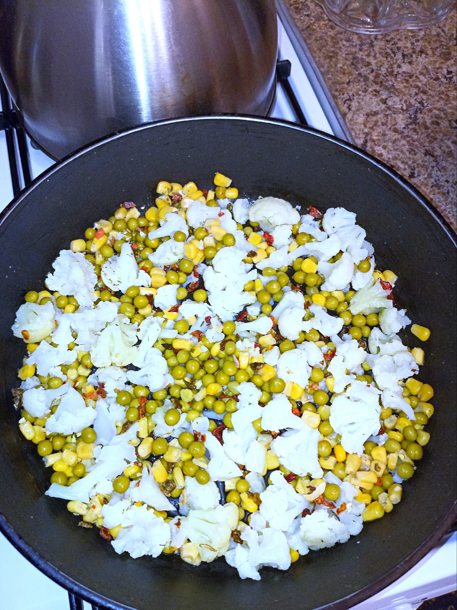На ужин я приготовила омлет с кукурузой, зелёным горшком и цветной капустой.👇🏼