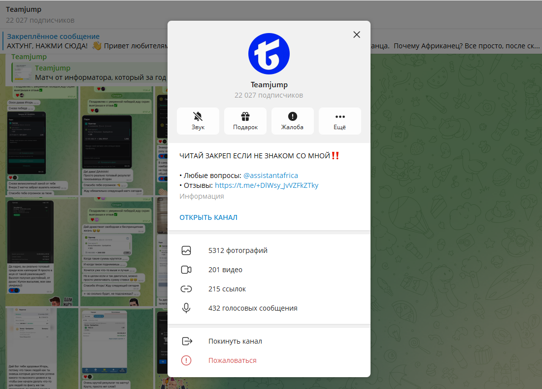 Телеграм-канал Teamjump подаётся как инновационный проект для ставок, обещающий эксклюзивные инсайды и почти стопроцентную проходимость. Автор утверждает, что за проектом стоит команда профессионалов с многолетним опытом и доступом к закрытой информации.