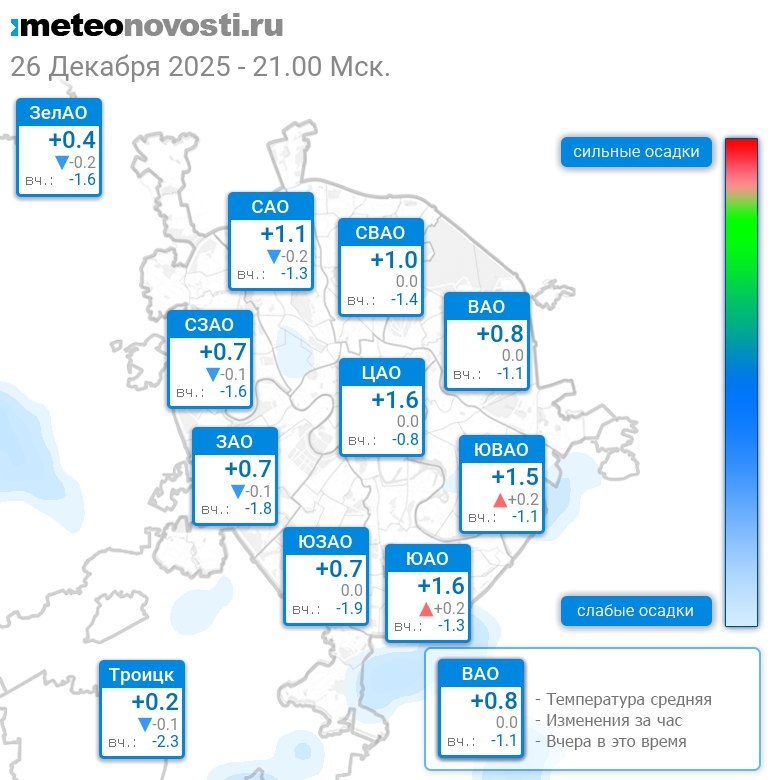 В 21:00 в Москве было от 0°C до +1.9°C, средняя температура +1°C #погода #Москва #зима #температура #26декабря #пятница