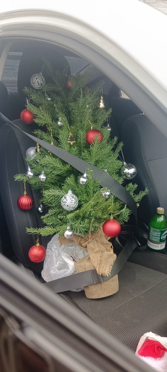 Сегодня перевозил из одной квартиры в другую ёлку небольшую, ёлочка уже наряженная. Посадил её на переднее сиденье потому что на заднем у меня детки,пристегнул ремнем чтоб не упала. Останавливает меня гаишник я сразу открываю свое и заднее стекло показываю что дети все пристегнутые и в креслах и начинаю доставать документы из бардачка . Слышу какой-то сдавленный писк перерастающий в ржач. Поворачиваюсь чтобы протянуть документы а он на меня даже и не смотрит ржёт и сквозь смех в сторону: -Виталь! Иди посмотри! У него даже ёлочка пристегнутая!!! Подошёл Виталь,поулыбался,спросил разрешения сфоткать ( Может где и вылезет это фото на просторах интернета). Проверили документы,пожелали счастливого пути и пожелания всех благ в новом году,я поехал так же пожелав им хорошей смены и самых лучших выходных. Ну и вот собственно фото самой виновницы небольшого происшествия.