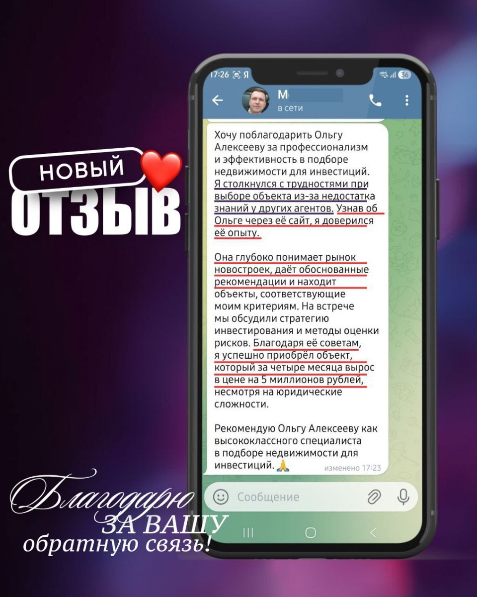 Четыре месяца спустя клиент увидел результаты и поделился, что инвестиция оправдала ожидания: выбранный объект вырос в цене, стратегия сработала, а оценка рисков была точной. Это доказательство того, что я работаю правильно и с вниманием к каждой детали. Благодарю каждого, кто пишет такие отзывы — они придают уверенности и вдохновляют двигаться дальше. Я делюсь этим не для похвалы, а чтобы вы понимали: обращаясь ко мне, вы получаете не обещания, а продуманную стратегию и реальные решения, которые работают на вашу прибыль. Если вы задумались об инвестициях в недвижимость или хотите проверить свой портфель — пишите мне. Помогу подобрать объект, который будет соответствовать вашим целям и приносить доход.