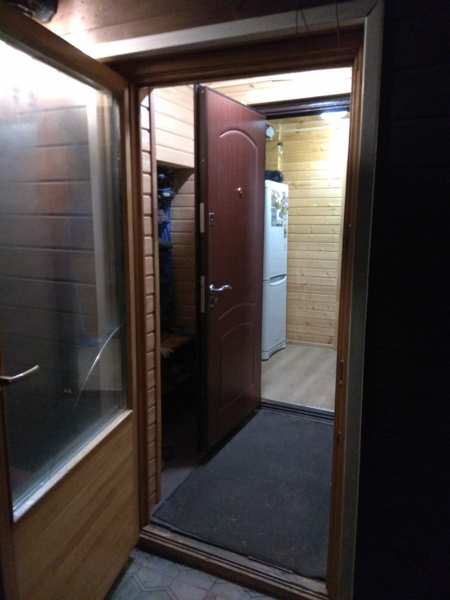 Как-то оказалось, что фото до переделки этого места практически нет, только плохонькие и не особо понятные. Ну что есть. Вид из первого тамбура в прихожую и из кухни туда же.