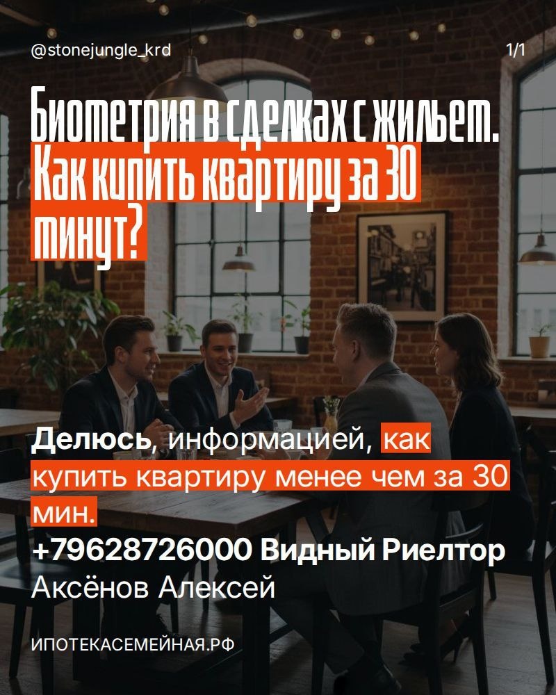 Как купить квартиру за 30 минут? Уже в 2026 году для покупки или продажи квартиры не обязательно будет ходить в МФЦ. ‼️ Все можно будет сделать дистанционно без бумажной волокиты — через «Госуслуги» или банк, используя биометрию. Сейчас удалённые сделки тоже можно проводить, но с помощью электронной цифровой подписи. При использовании биометрии время на сделку сократится буквально до 30 минут. ℹ️ Главное условие — заранее сдать биометрические данные в Единую биометрическую систему. 🔽 При этом внедрена надёжная защита личных данных от мошенников (данные хранятся в виде кодов, а не фото или записей голоса). На первый взгляд, все выглядит просто и удобно. Но, исходя из моего опыта, далеко не все клиенты готовы к кардинальным переменам. Выбор за вами! Вы планируете покупку или продажу квартиры — обращайтесь за консультацией. Подберу для вас самый удобный механизм! 📞 +79628726000 ❤️ @stonejungle_krd 💬 @vidnirealtor Если остальные соцсети опять будут сбоить или замедляться