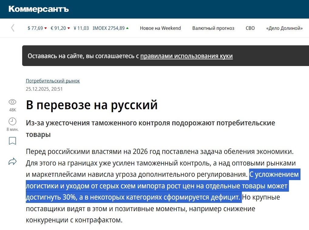 С наступлением 2026 года российских граждан ожидает очень специфическая раздача "подарков", которая в официальных пресс-релизах стыдливо именуется «структурной трансформацией», а на языке суровой реальности означает тотальное и масштабное изъятие денежных знаков у населения. Согласно данным, опубликованным «Коммерсантом» со ссылкой на экспертов Strategy Partners, президентская директива об «обелении» экономики, назначенная на грядущий год, обернется для потребителя не порядком, а банальным скачком цен. Таможня, исполняя высочайшую волю, усиливает хватку, борьба с контрафактом (читай: с дешевым импортом) выходит на проектную мощность, и, как следствие, эра дешевых товаров с маркетплейсов заканчивается. Прогноз неутешителен: непродовольственный сегмент подорожает на 10–15%, а категории, зависимые от логистики — электроника, одежда, мебель, — прибавят в цене до 30%. Разумеется, это преподносится как благо, ведь государство наконец-то получит свои налоги с каждой проданной китайской заря