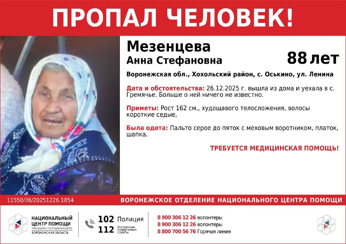 ВНИМАНИЕ!!! Пропал человек 88 лет! Мезенцева Анна Стефановна Воронежская обл., Хохольский р-н, с. Оськино, ул. Ленина/ с. Гремячье. НУЖДАЕТСЯ В МЕДИЦИНСКОЙ ПОМОЩИ! Если Вам известна какая-либо информация звоните по телефонам 8-900-306-12-26, 102, 112.