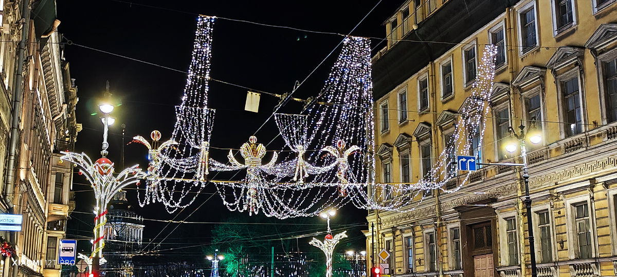 Переходила Невский проспект и мои глаза увидели это великолепие. Яркие большие гирлянды натянуты через дорогу.