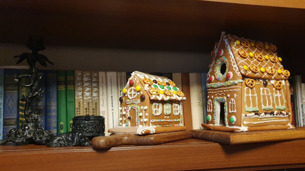 На полке с книгами разместились пряничные домики, которые племянница сама напекла к Новому Году и украсила, очень красивые, а какой волшебный запах имбиря, специй и сахара по всей комнате от них. Сразу создается праздничное настроение.