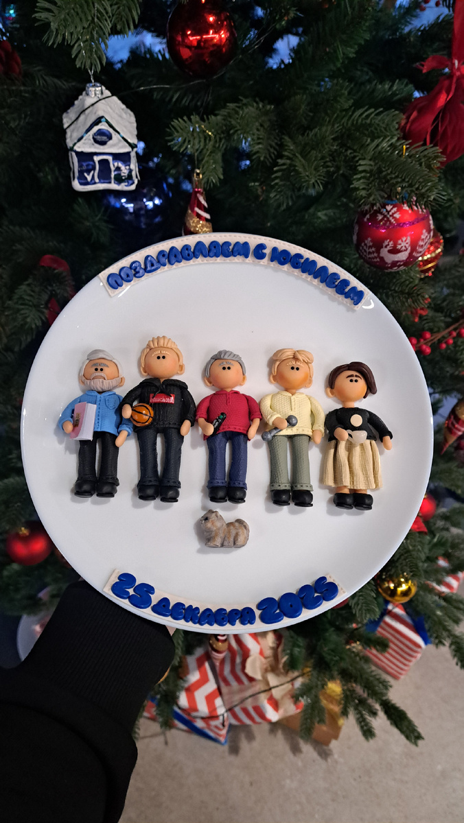 Тарелка с изображением всех членов семьи, включая питомцев! 🐱🐶 Фигурки выполнены из полимерной глины в стиле кукол Тильда. Сходство — приблизительное, но каждый персонаж узнаваем по элементам одежды или предмету в руках. 👕🎾