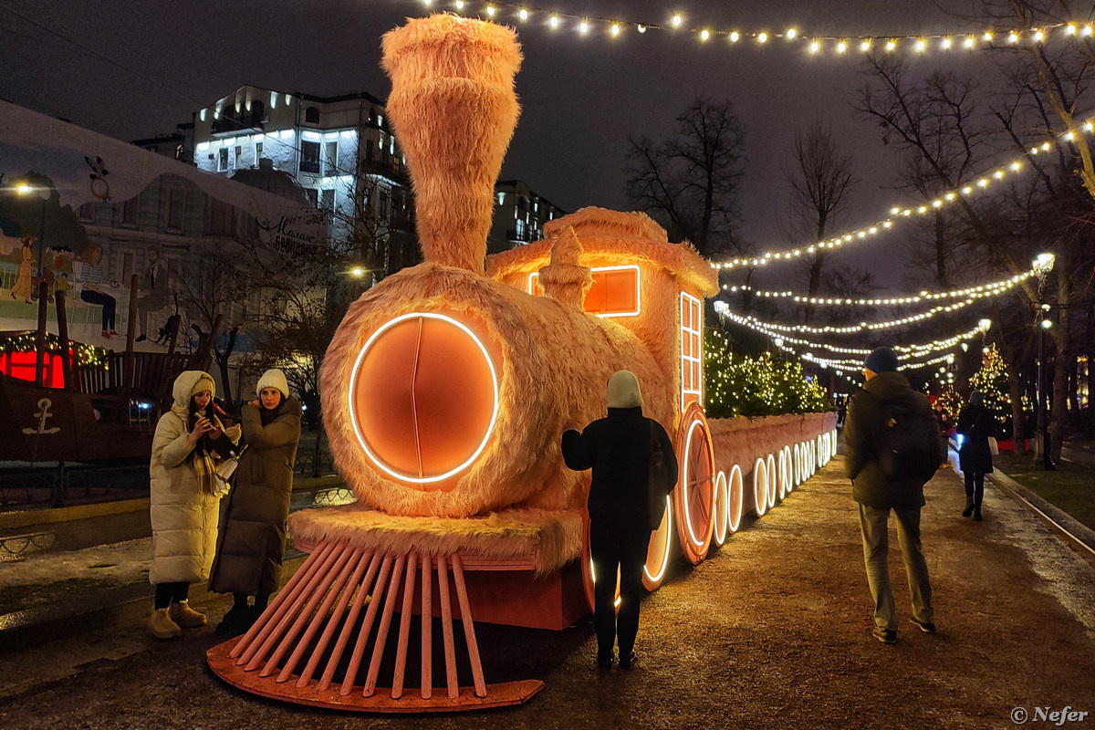 Гламурный розовый меховой паровоз и 57 елок на Тверском бульваре
