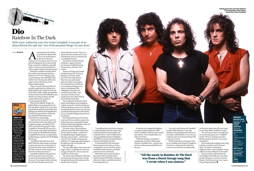 Конечный результат, известный под названием Rainbow In The Dark, стал «одной из моих вещей, которой я горжусь больше всего», говорит Ронни. «Это настоящий рок, а не просто шум. Отличная песня».
