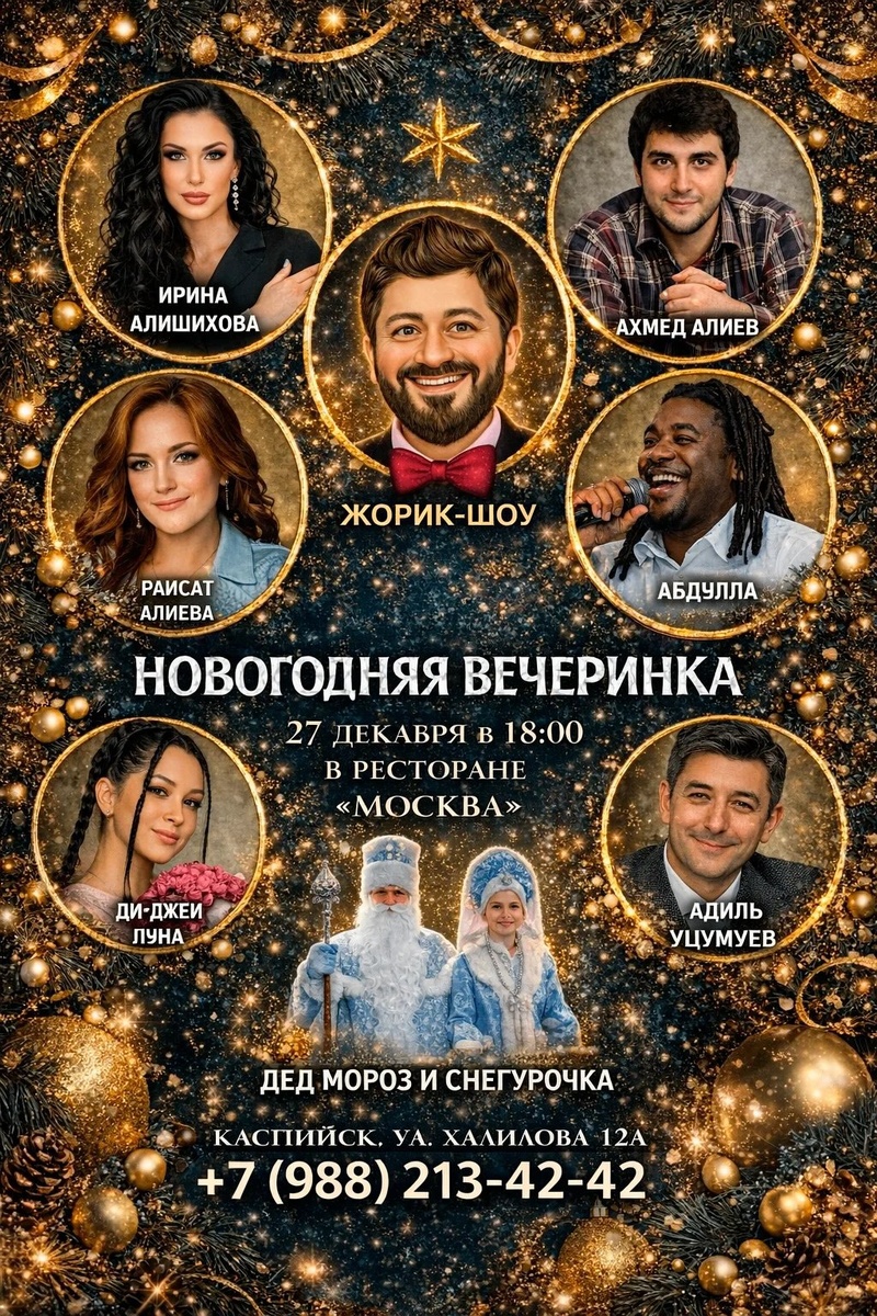»! ✨ 27 декабря вас ждёт незабываемый вечер, наполненный музыкой, весельем и праздничным настроением! Что вас ожидает: ❗ яркие выступления звёзд дагестанской эстрады — зарядимся энергией и драйвом; ❗ изысканное новогоднее меню от шеф‑повара — гастрономические открытия гарантированы; ❗ праздничная атмосфера и декорации — погрузимся в волшебство предстоящего праздника; ❗ танцевальный марафон до утра — будем зажигать под любимые хиты! Не упустите шанс встретить Новый год в кругу друзей, под звуки любимой музыки и в обстановке настоящего праздника! 📍 27 декабря в 18:00 ресторан «Москва» ул. Халилова 12а Бронируйте места уже сейчас 📱8-988-213-42-42 — количество столиков ограничено! 🎞🎞🎞🎞🎞🎞🎞🎞🎞🎞🎞🎞🎞 #НовогодняяВечеринка #РесторанМосква #крцмосква #каспийск