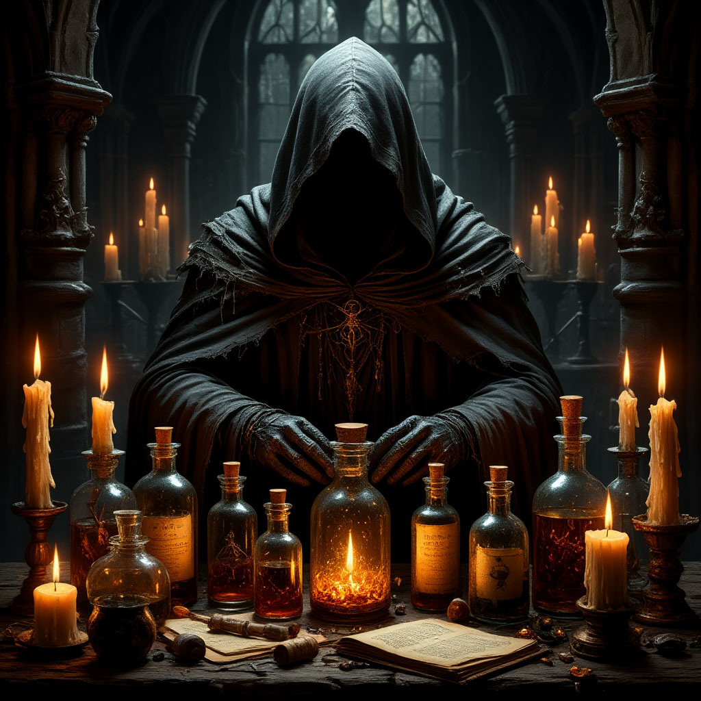 Темная фигура сидела в маленькой комнате и перебирала пузырьки со снадобьями и пакетики с порошками..