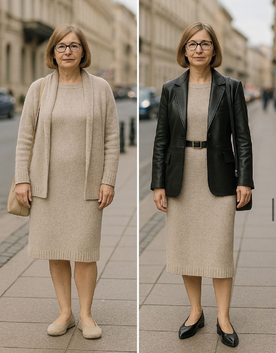 Всегда интересно смотреть на результат трудов профессионалов, буквально преображающих образ женщины внесением в них достаточно небольших изменений. 1. Бежевый трикотажный ансамбль из прямого лаконичного платья и такого же кардигана выглядит, конечно, женственно, однако его проблема в том, что трикотаж не слишком выгодно облегает фигуру, зачастую подчеркивая ее недостатки. А вот если дополнить платье черным кожаным ремнем, создающим акцент на талии, а от кардигана избавиться, заменив на стильный приталенный кожаный жакет черного цвета, образ будет производить совсем другое впечатление. Кстати, обновить стоит и обувь: бежевые балетки в тон наряду лучше всего заменить на практичные черные туфли на невысоком каблуке, которые по цвету сочетаются и с жакетом, и с ремнем. 2. Зауженные светло-синие джинсы, светло-коричневый минималистичный стеганый пуховик и ботильоны на устойчивом каблуке – практичный, удобный и необыкновенно скучный наряд, который, к тому же показывает фигуру негармоничной и