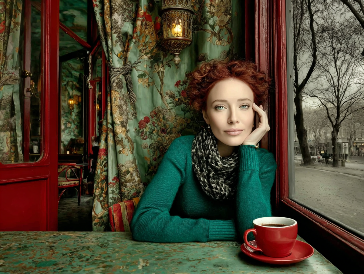 Но наверное имеет значение, что Профиль делать долго. Для этого надо выбирать понравившиеся изображения из предложенных и набрать их 200 штук! А мудборд можно быстро собрать из 10-15 картинок. Сегодня я не могла успокоиться пока не создала несколько профилей и мудбордов. И сейчас мы просто возьмем один промпт и сделаем одну генерацию без персонализации, а затем несколько с разными профилями и мудбордами. Вот такой бесхитростный промп я выбрала, где говорится, что женщина 30 лет сидит с чашкой кофе у окна в кофейне. Waist portrait of a 30-year-old woman sitting near a window in a coffee shop. A woman is sitting at a table and holding a steaming mug of coffee with both hands. She's wearing a cozy wool sweater. She has reddish hair. She looks direc