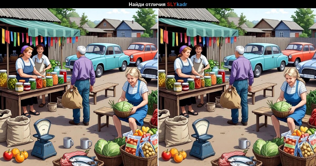 Сегодня вас ждёт тёплая деревенская сцена с рынком, овощами и неспешной жизнью. Но не всё так просто — перед вами задача для самых внимательных 👀