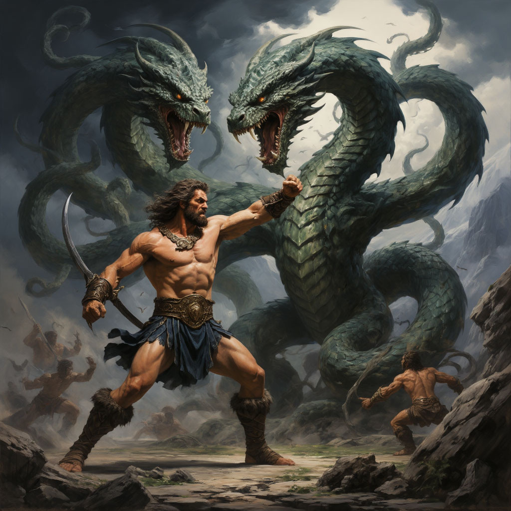 По приказу царя Эврисфея Геракл должен был уничтожить Лернейскую гидру — чудовище с телом змеи и множеством голов (в разных версиях мифа — 7, 9, 50 или даже 100). Гидра: была порождена Тифоном и Ехидной, вскормлена богиней Герой; обитала в болотах возле города Лерны, под платаном у истоков Амимоны; опустошала окрестности, похищала скот, отравляла воздух ядовитым дыханием; имела одну бессмертную голову, остальные были смертными Геракл отправился в Лерну вместе с Иолаем — сыном Ификла и своим верным спутником. Прибыв к болоту, Геракл: оставил Иолая с колесницей в близлежащей роще; сам направился к логову гидры — пещере, окружённой болотом. Геракл раскалил стрелы и начал обстреливать гидру. Чудовище вышло из пещеры, поднялось на хвосте и бросилось в атаку. Геракл наступил гидре на туловище, прижав к земле. Гидра обвила его ноги хвостом, пытаясь свалить. Герой начал сбивать головы палицей — они слетали, но на месте каждой отрубленной вырастали две новые. Из болота выполз гигантский рак (