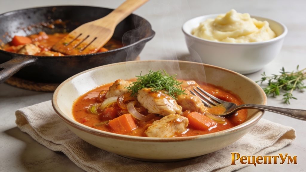 Стояла у плиты, смотрела на куриное филе… Снова тушить? Скучно. А что если превратить обычную курицу в то самое блюдо, которое просят готовить снова и снова? — Мам, а что сегодня на ужин? — спросила дочка, заглядывая в кухню. Я уже раскалила сковороду. Гуляш из курицы с бархатной томатно-сметанной подливкой — мой способ накормить семью за 40 минут так, чтобы тарелки вылизывали до блеска! Нежное мясо, ароматный соус… Это блюдо спасает меня в будни и выручает на выходных. Для более насыщенного вкуса замените воду куриным бульоном — аромат усилится в разы! Если любите поострее, добавьте щепотку молотого чили или острой паприки.Хотите более густую подливу? Увеличьте количество муки до 2 столовых ложек. Для диетического варианта замените сметану натуральным йогуртом без добавок…Гуляш отлично сочетается с картофельным пюре, гречкой, рисом, макаронами или даже с хрустящим хлебом для макания в соус! Блюдо можно заморозить порциями — разогревайте в микроволновке или на сковороде с добавлением л