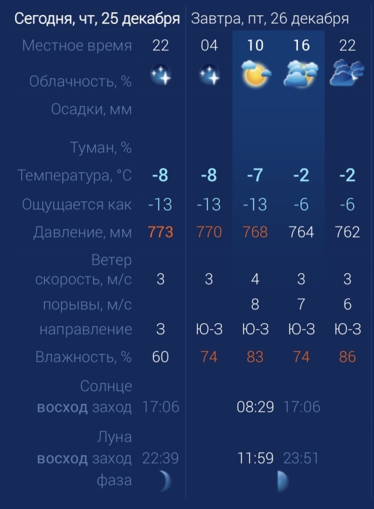 В пятницу в Астраханской области ожидается переменная облачность, повышенная влажность. Также возможен туман. Утром температура воздуха в городе составит ‑7 градусов. Днем температура поднимется до ‑2. К вечеру погода не изменится. Астраханцев ждет юго-западный ветер со скоростью 3 – 7 м/с. Атмосферное давление составит 764 мм рт. ст. Влажность воздуха выше нормы. На территории всего региона будет юго-западный ветер со скоростью 3 ‑7 м/с. Температура воздуха ночью опустится до ‑8 градусов, а днем повысится до ‑1. Сообщение 26 декабря в Астраханской области будет влажно и холодно появились сначала на Астрахань.Ру последние новости региона.