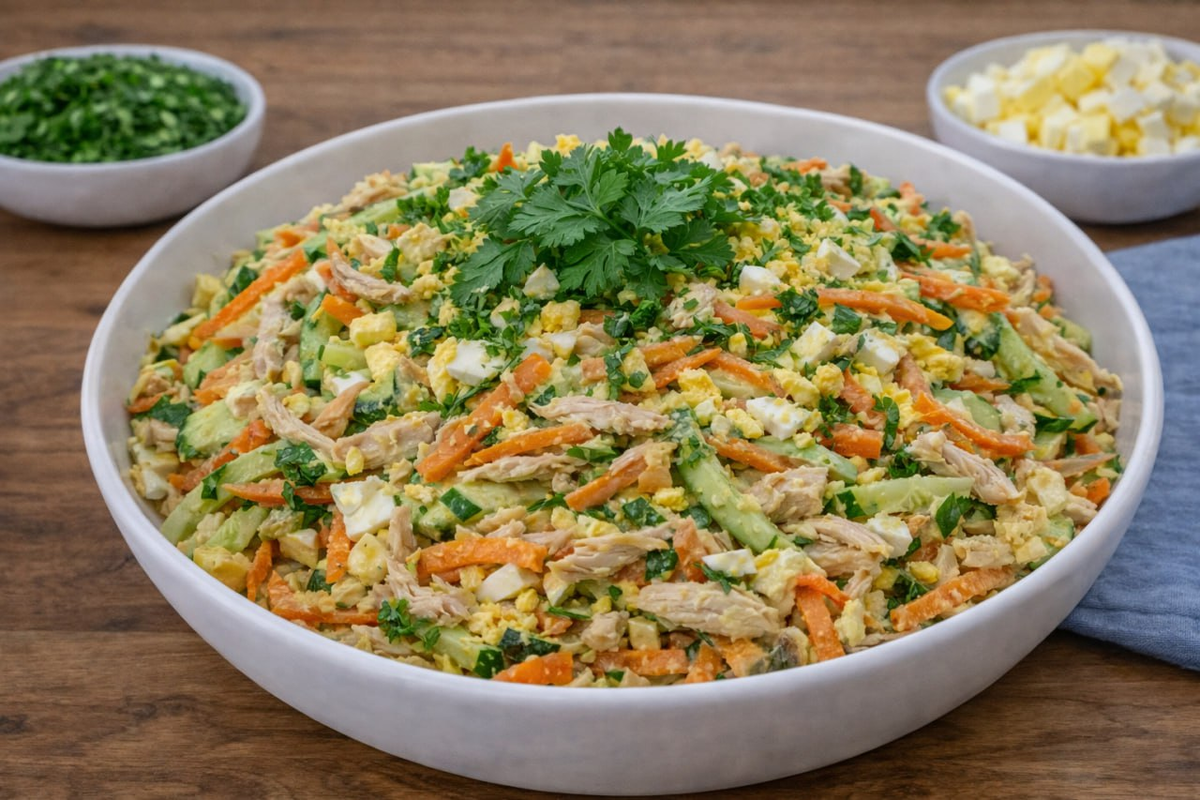 Здравствуйте, мои хорошие! Есть салаты, которые не кричат о себе, не стараются удивить сложными сочетаниями, но при этом запоминаются надолго. Салат «Прага» как раз из этой категории. Он спокойный, аккуратный, очень сбалансированный по вкусу. Такой салат хочется готовить, когда надоело всё тяжёлое и майонезное, когда душа просит чего-то лёгкого, но при этом сытного и домашнего. «Прага» хорош тем, что выглядит просто, а вкус у него глубокий и продуманный. Здесь нет ничего лишнего: курица, овощи, яйца и нежная заправка на желтке с горчицей и оливковым маслом. Всё на своих местах. Этот салат отлично подходит и для будничного ужина, и для стола «для своих», когда хочется поставить что-то аккуратное, но без лишнего пафоса. Мне нравится готовить «Прагу» заранее, дать ему немного постоять в холодильнике, а потом красиво переложить в салатник, добавить зелени — и всё, можно звать домашних к столу. Он не надоедает, не перегружает и съедается всегда с удовольствием. Ингредиенты: Как приготовит