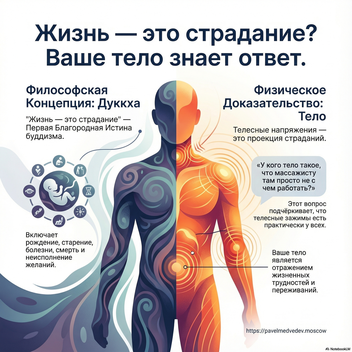 Этот риторический вызов обезоруживает, потому что он универсален. Практически любой человек, вне зависимости от возраста, профессии и мировоззрения, придя на сеанс массажа, услышит от специалиста о наличии зажимов в шее, напряжении в спине или скованности в плечах. Это общее для всех нас состояние и есть неопровержимое физическое доказательство того, что жизнь постоянно бросает нам вызовы, которые мы «складируем» в своём теле.