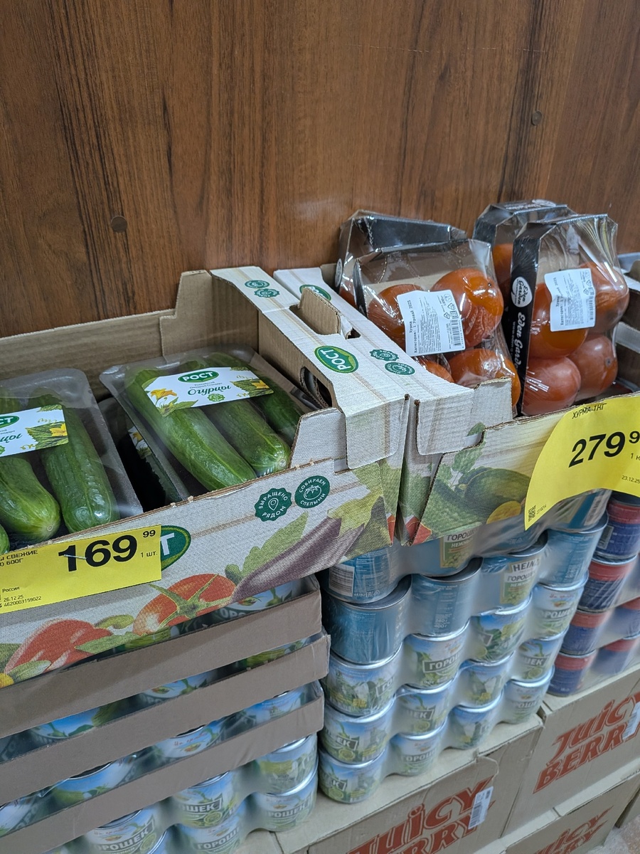 Привезли огурцы, на салаты они точно пригодятся, правда стоят 169 рублей; хурма и вовсе по 279, но я все не могу понять - она выглядит так, словно она уже чересчур спелая, хотя все упаковки одинаковые и, наверное, это просто такой вид; мандарины за 299 точно не купила бы, максимально вкусные и сладкие в супермаркете продаются буквально за 169/кг.