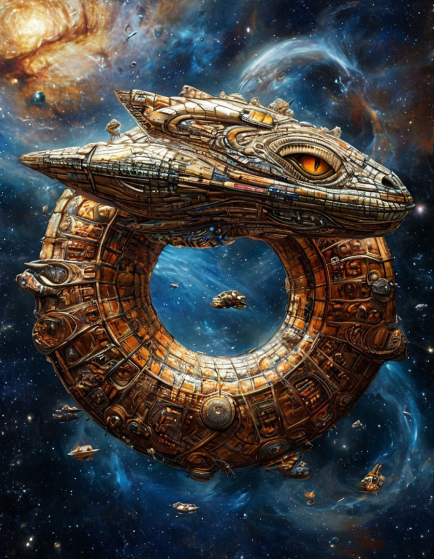 В конце концов континентальный совет планеты Хорот направил дипломатическую миссию на «Уроборос» — корабль людей, названный именем мифологического змея, кусающего себя за хвост. Когда-то давно этому загадочному существу то ли поклонялись, то ли возносили проклятия. Гибкий корпус состоял их сотен секций каждая размерами в десятки миллиардов километров, что позволяло менять форму всей конструкции. Последним «Уроборос» ещё больше походил на пресмыкающееся.
