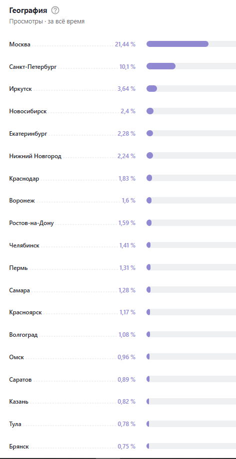Совсем уже немного времени остается до того, как Новый 2026 год вступит в свои права. Долго размышлял о том, как бы создать некую карту канала. Некоторый топ мест, из которых заходят на канал читатели, выдается статистикой платформы. У меня это выглядит следующим образом: В принципе картина стабильна уже на протяжении последних двух лет. В первый месяц жизни канала Иркутск еще был на втором месте (исключительно потому, что я делал ссылки на канал в своих соцсетях, и понятно, что у меня там очень много друзей именно в Иркутске, которые и заходили на канал). Но потом родной Иркутск переместился на третье место, хотя, конечно, я считаю большим достижением, что из Иркутска меня много читают. Всё-таки уже достаточно давно про сам наш город я ничего предметно не пишу, но читатели из моего родного города уверенно удерживают 3-ю позицию в топе. Вообще я должен объективно похвалить свой Иркутск - в целом у нас достаточно образованные люди, которые многим в этой жизни интересуются. Наверное, от