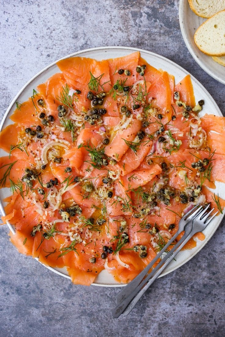 Для французского рецепта засолки понадобится спинка форели или лосося: рассчитать количество специй можно по весу (на 1 кг). Также будет необходима широкая стеклянная или керамическая форма, в которую войдет спинка форели целиком и любая емкость для пресса, чтобы рыба просолилась как следует (можно взять форму поменьше и, например, поставить сверху банку с водой).