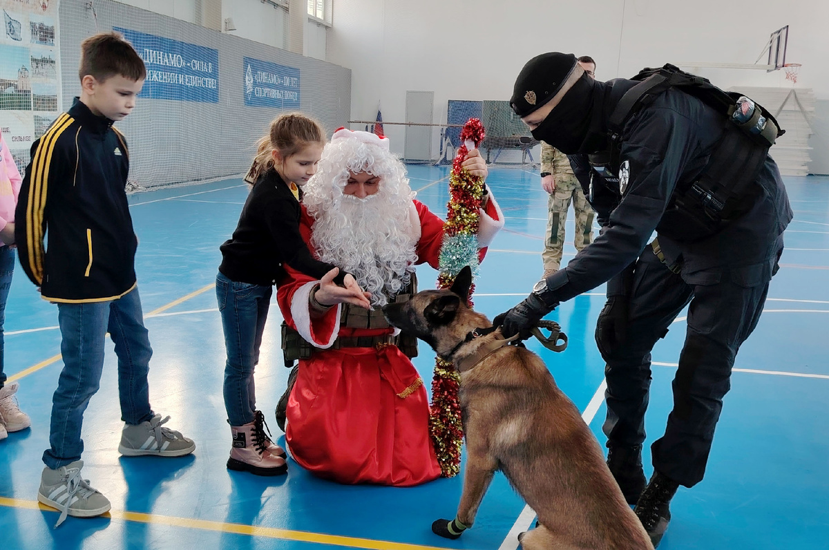 В рамках всероссийской ведомственной акции «Дед Мороз специального назначения» военнослужащие и сотрудники Восточного округа Росгвардии продолжают посещать подшефные организации, центры социальной реабилитации и детские сады. Главная цель – создать праздничное настроение ребятам, которые перед зимними каникулами ждут чуда и волшебства. Ежегодно хабаровский центр помощи семье и детям росгвардейцы навещают детей, оказавшихся в сложной жизненной ситуации, преподнося им различные сюрпризы. В уютном зале перед ребятами выступили музыканты военного оркестра Росгвардии со специально подготовленным праздничным репертуаром. Кинолог ОМОН «Тигр» (на транспорте) продемонстрировала выучку своей четвероногой напарницы – бельгийской овчарки по кличке Вайпер. Росгвардейцы вручили юным хабаровчанам сладкие пироги и пожелали, чтобы все заветные мечты ребят поскорее исполнились. А воспитанники центра в свою очередь передали привет и самые тёплые поздравления сотрудникам спецназа Росгвардии, выполняющих