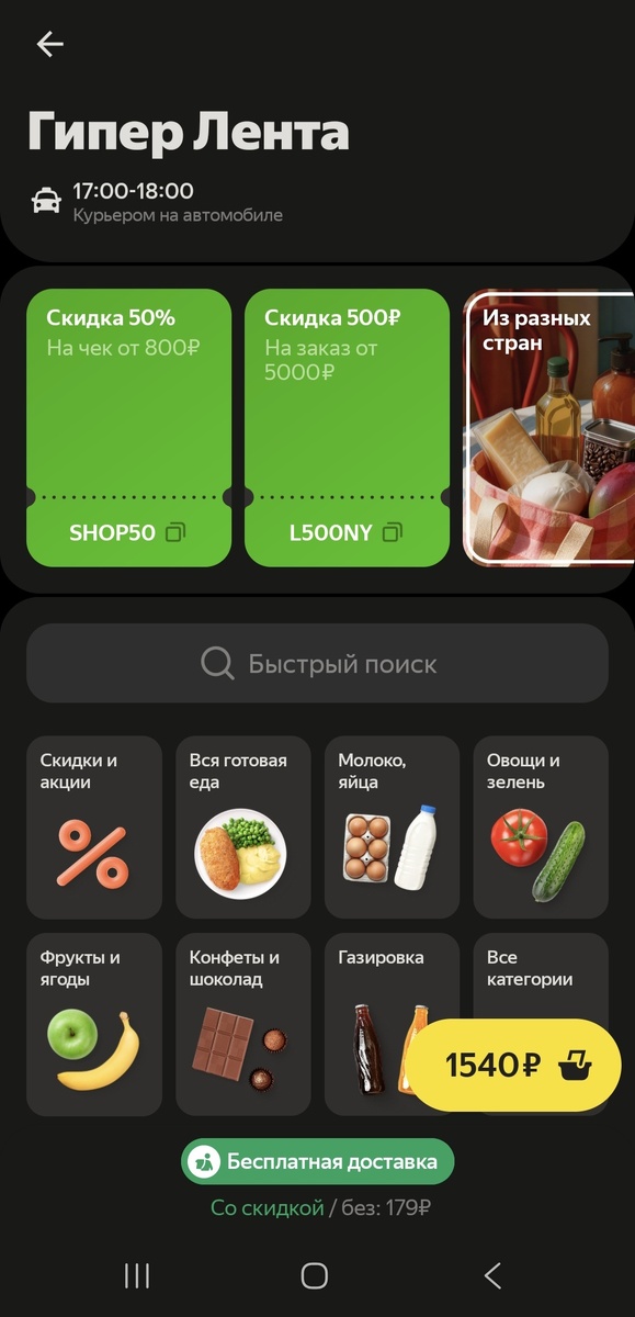 Грустно посмотрев с утра на цены на говядину в Ленте онлайн, (ещё и за 700 грамм!), решила пойти поглядеть в других местах. И оппаньки, в Яндекс еде нас ждёт вкусный промокод аж на 50 процентов скидка при заказе от 800 рублей, прям аттракцион невиданной щедрости! Но мы же все вместе живём в одной большой и хитрой стране, так что делаем скрин на всякий случай. Ну красота же, верно? Набираем, еле дыша от радости, корзину аж на пять тыщ рублей! Я богачка, да, не завидуйте. (Сарказм, к сожалению). И, при оплате, конечно же, видим скидку с промокодом всего то 500 рублей. Ошибка? Идём спрашивать у оператора. Обидно, слющай. Ну чтож, на этой неделе, значит, опять у нас курица в рационе. Другой промокод не дали, решать вопрос отказались. Я не знаю наверняка, является ли это публичной офертой. По логике-да.