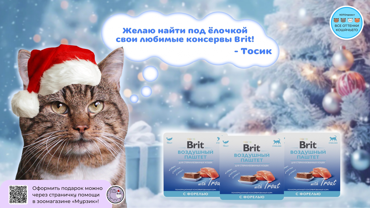 Уже скоро наступит долгожданный праздник Новый год, и вместе с ним всё праздничное веселье. Все наши подопечные стараются восстановить свое здоровье и прихорошить себя, чтобы встречать гостей и подарки во все дни праздника. 🐈 К сожалению, в этом году не все котики обрели свою любящую семью, поэтому они продолжат встречать праздники в приюте. Самыми близкими людьми для них сейчас являются ВСЕ ВЫ - наши помощники, КотоФеи и Волшебники! Ваша ежедневная поддержка и старания нашей КотоМамы дарит им теплоту, заботу и чувство важности. Поэтому предлагаем ВАМ присоединиться к нашему новогоднему марафону «Волшебный подарок для котика»! Благодаря нашему хорошему другу зоомагазину «Мурзик» — вы можете украсить нашу новогоднюю ёлочку 🎄различными подарками, даже находясь в другом городе или стране! Вне зависимости от количества и размера подарков — котодетки с огромной благодарностью примут всё в свои лапки! 🐾 В подарок на Новый год он мечтает получить свои любимые консервы Brit с форелью! Кажда