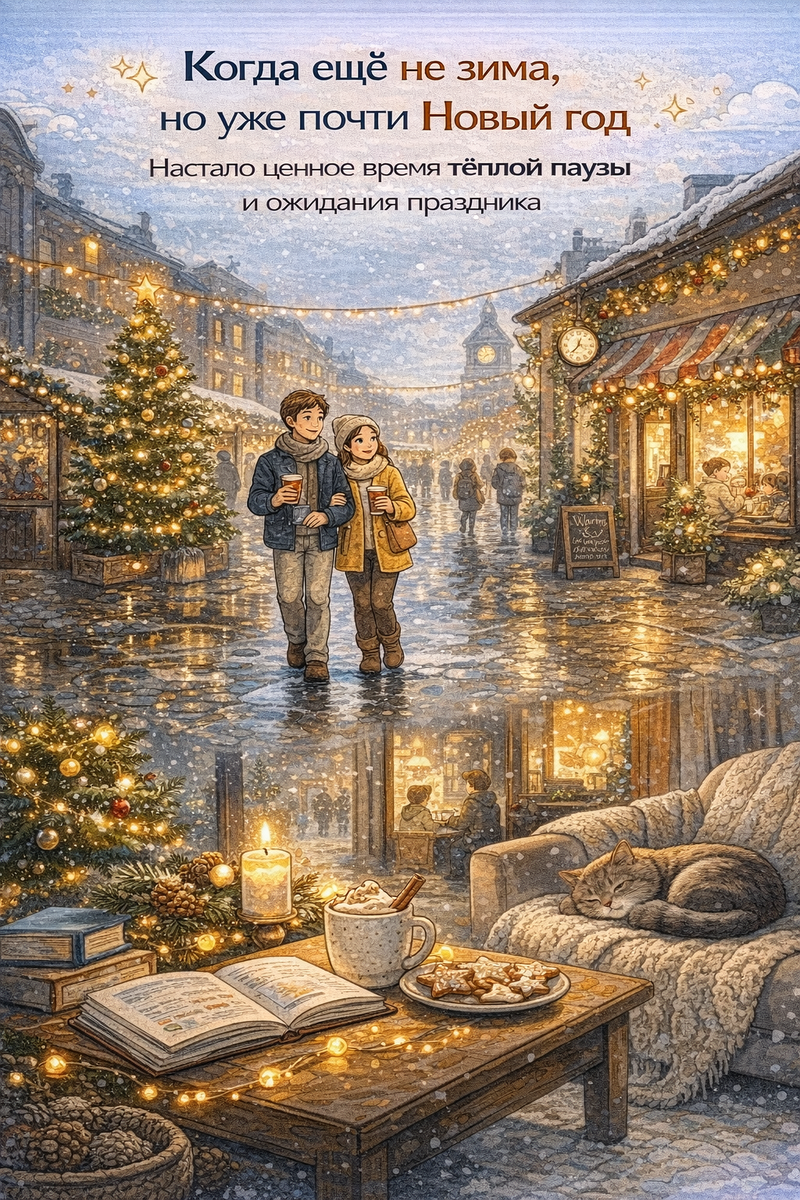 На улице лужи, серое небо, короткий день. Снег либо не выпал, либо уже растаял. А в календаре — ощущение, что Новый год где-то совсем рядом. Многие это время не любят. Кажется, что «ни туда ни сюда»: гулять некомфортно, зимних радостей ещё нет, а усталость года уже накопилась. Но если посмотреть внимательнее, это очень полезный и даже уютный период — если правильно к нему отнестись. Главная ошибка этого времени — пытаться жить так же активно, как летом или в начале осени.