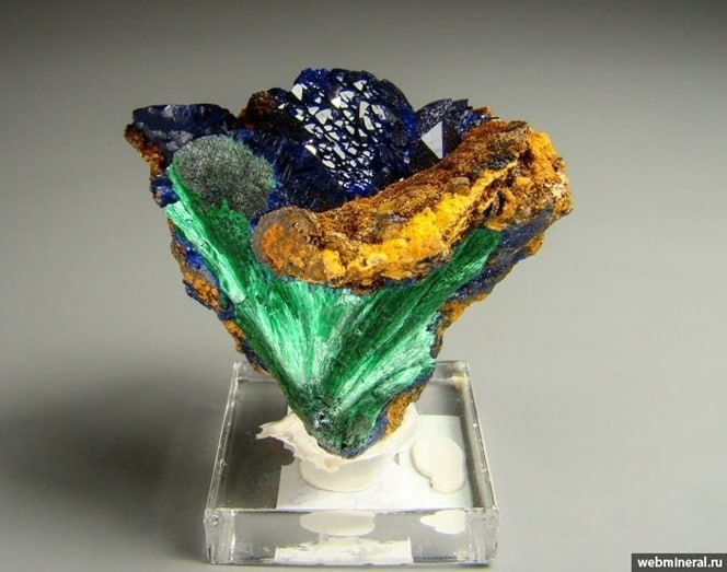 Натуральные минералы: небольшая друза хорошо ограненных кристаллов азурита основание которой замещено лучистым малахитом, местами с