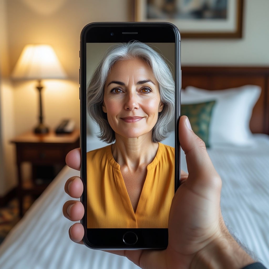 Миша, который был за спиной, обхватил меня руками за талию и притянул к себе. Перед моим взором появился мой же телефон, на экране которого я увидела лицо пожилой женщины с седыми волосами, но со всё теми же тёплыми шоколадными глазами