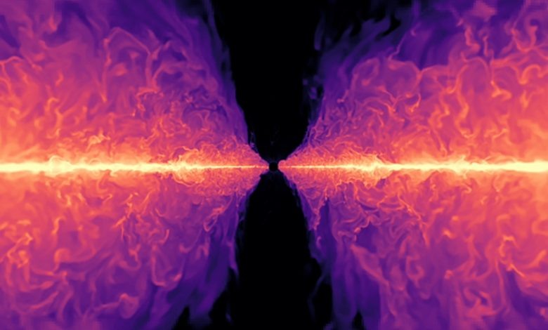 Симуляция показала, что вокруг быстро вращающейся чёрной дыры формируется плотный аккреционный диск. При этом не всё вещество поглощается: часть материи выбрасывается обратно в космос в виде узких релятивистских струй — джетов, формирование и направление которых определяется магнитными полями. Когда масса газа достигает определённого порога, возникает своеобразный канал, затягивающий материю с колоссальной скоростью и создающий направленный пучок излучения, заметный лишь при определённом угле наблюдения.