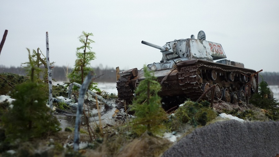 Обратил свой взор на КВ, давно стоявший на полке!( который почти не видно было за камуфляжной пылью) решил его воскресить! перекрасил , добавил решетку на м.о., и тут пошло поехало! по лесам по болотам! По дороге что то забрякало вот мех и вышел посмотреть! Красил как всегда тамия,снег - сода и пва.