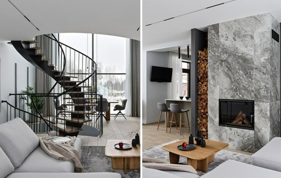 Дом трехэтажный, в него можно зайти со всех сторон, одно из больших окон поменяли на раздвижную конструкцию, в будущем там будет терраса. На цокольном этаже разместили зону отдыха, ТВ, хаммам, спортзал. На первом этаже основные помещения — большая кухня с барным островом, гостиная с настоящим камином, кабинет и гостевая комната. На втором этаже — спальни для взрослых и детей. Фишка интерьера — винтовая лестница по центру дома и огромное окно высотой 5,4 м.