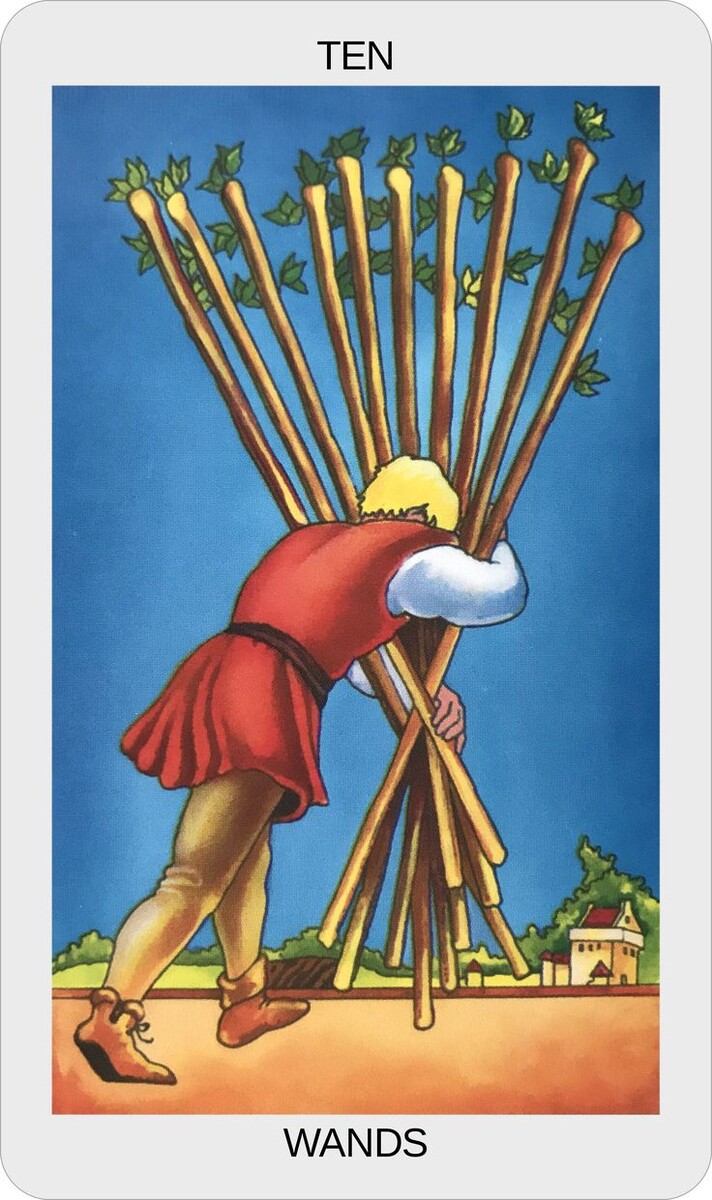 Дорогие странники и искатели пути, Сегодняшняя карта - не просто предсказание. Это зеркало. Зеркало тех, кто давно перестал замечать, как ноша стала продолжением их спины. В мире, где «нельзя показать слабость», Десятка Жезлов шепчет другое: «Ты не обязан нести всё. Даже если ты - опора для других». Эта карта - голос древних огней, зажжённых в сердцах тех, кто слишком долго молчал под тяжестью ответственности. Давайте раскроем её тайны - вместе с мудростью Таро и заботой о себе. Десятка Жезлов: символизм и образ На карте изображён человек, идущий по пустынной дороге, согнувшись под тяжестью десяти жезлов, связанных в пучок. Его лицо скрыто, спина напряжена, шаг усталый, но упрямый. Путь ведёт вдаль, к горизонту, где едва угадываются очертания поселения - возможно, спасения, возможно, новой ноши. Жезлы - символ стихии Огня: воли, энергии, творчества, инициативы. Но здесь огонь не горит - он сжат. Связан. Десятка Жезлов - это энергия, запертая в теле, в обязанностях, в страхе отпустить