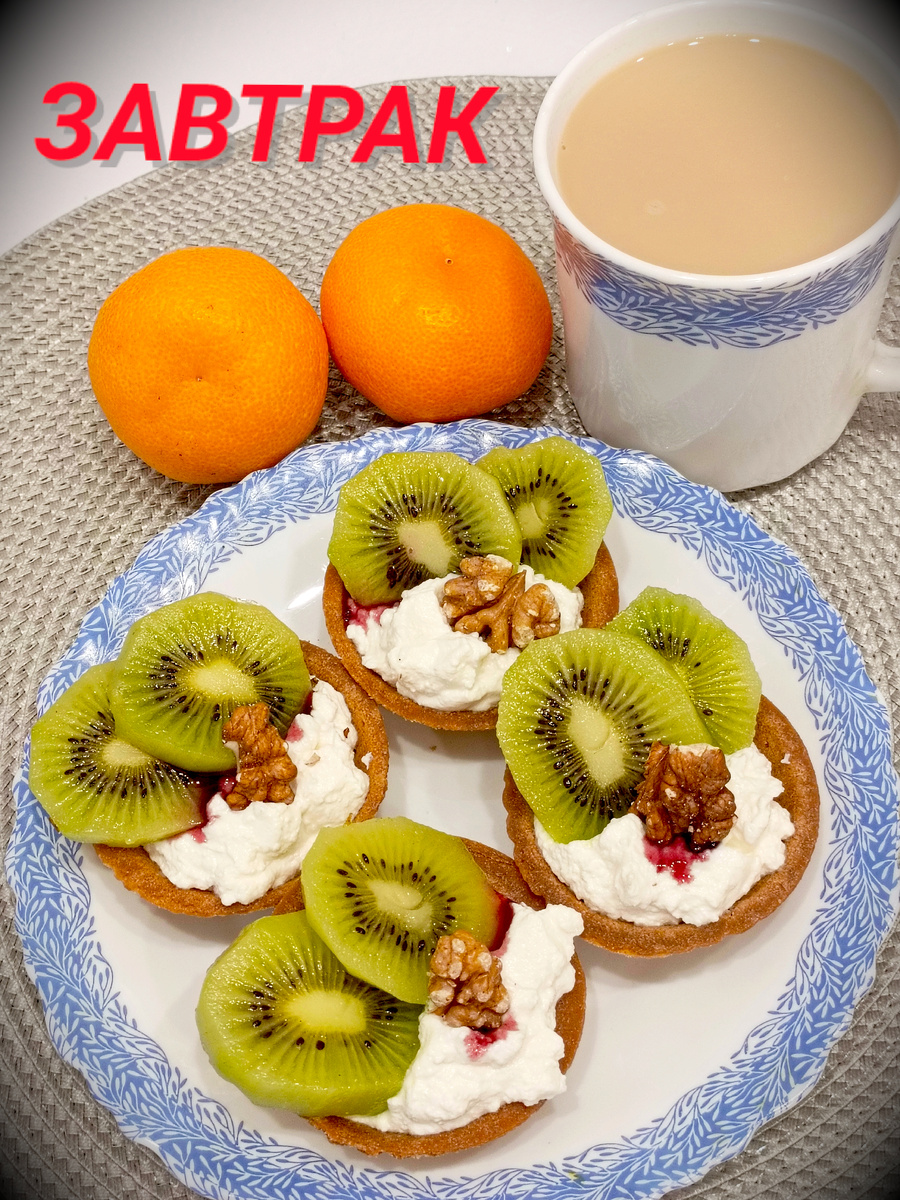 На завтрак у меня ржаные тарталетки с рикоттой, киви, грецким орехом и капельками
