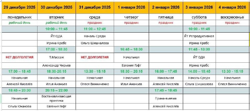 Приветствуем, друзья 👌 Обратите внимание на изменения в расписании занятий на новогодние праздники. 🟢Некоторые занятия будут проводиться по предварительной записи от 2-х человек. Пожалуйста, уточняйте информацию заранее! Возможны небольшие изменения в расписании, поэтому следите за обновлениями на сайте студии 🙏Особое внимание уделите Универсальной йоге, которая состоится 5 января и выделена жёлтым. Это спецкласс продолжительностью 2,5 часа по отдельной цене. Занятие пройдет при условии набора группы от 5 человек. Запись на занятие осуществляется через справочный студии @yoga108admin. Не упустите возможность зарядиться энергией и гармонией в праздничные дни! ОМ ШАНТИ ШАНТИ ШАНТИ ✨