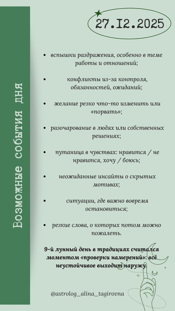 2️⃣7️⃣ декабря, суббота В 11:56 начало 9️⃣-го Лунного дня Растущая Луна в знаке ♈️Овен Общая характеристика дня 9-й лунный день считается одним из самых энергетически напряжённых. В древних лунных календарях его называли «днём испытаний», когда наружу выходят страхи, тени, импульсы и неосознанные реакции. Луна в Овне подталкивает к резким действиям, вспышкам гнева, желанию доказать, продавить, ускорить. Но сразу три квадратуры к Козерогу (Солнце, Венера, Марс) создают сильное внутреннее противоречие между «хочу сейчас» и «надо по правилам». Соединение Луны с Нептуном усиливает путаницу, иллюзии, эмоциональные качели. Можно легко перепутать интуицию с фантазией, а импульс — с истинным желанием. При этом секстиль к Плутону и Урану даёт шанс перевести напряжение в осознанное обновление. День не про разрушение, а про выявление слабых мест. Юнг писал: «Тень становится разрушительной только тогда, когда её не осознают». Вопросы дня: ❓Что сегодня меня задело сильнее всего — и почему?! ❓