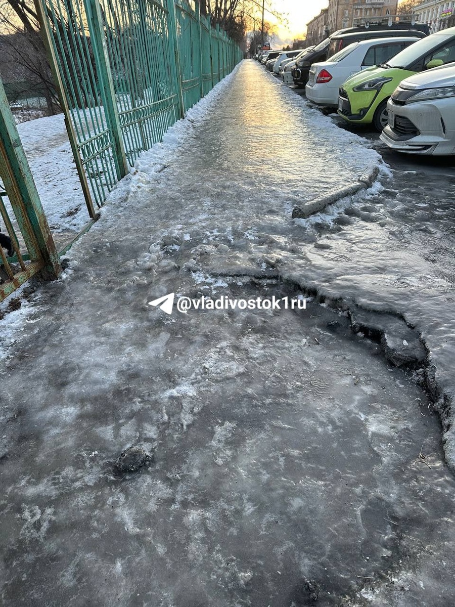 В Находке обстановка, кстати, не лучше. Читательница Карина поделилась фотографиями тротуаров рядом с парком на Рыбном порту и в самом парке. Достаточно проходное место все еще сковано льдом.